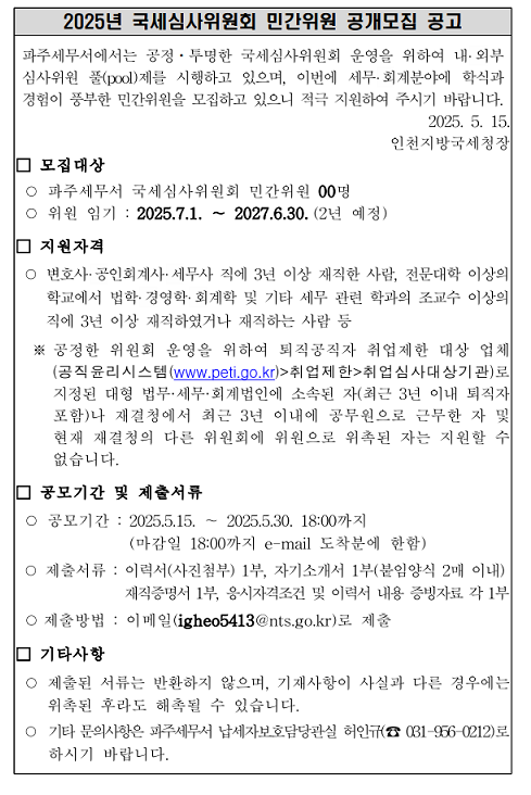 2025년 국세심사위원회 민간위원 공개모집 공고