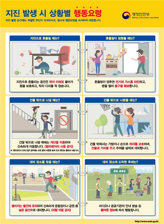 지진 발생 시 상황별・장소별 행동요령 [출처: 행정안전부]