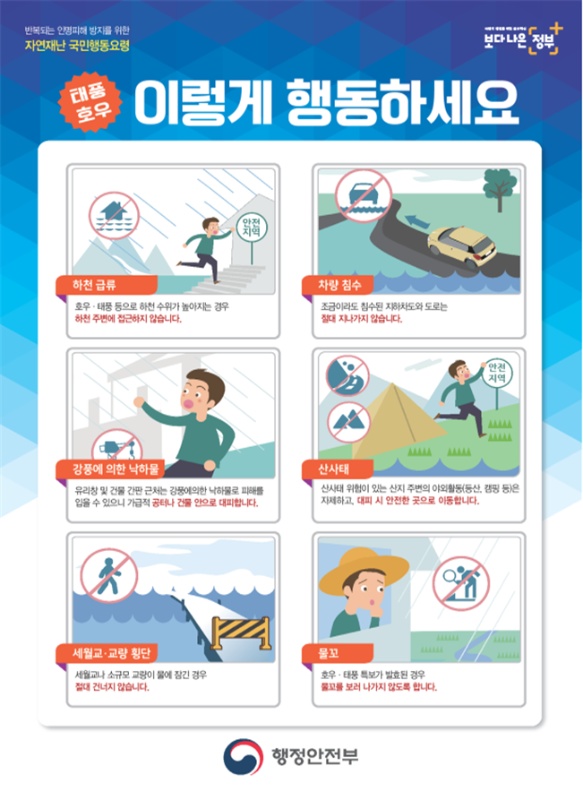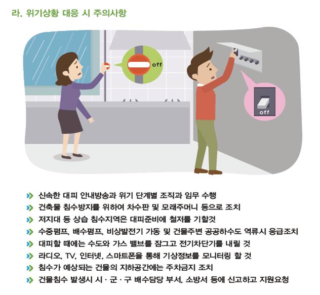 침수된 도로, 다리, 보도 등은 건너지 않기 ⇒ 침수된 도로, 다리, 보도 등은 파손 가능성이 있어 위험하므로 건너지 않기 |