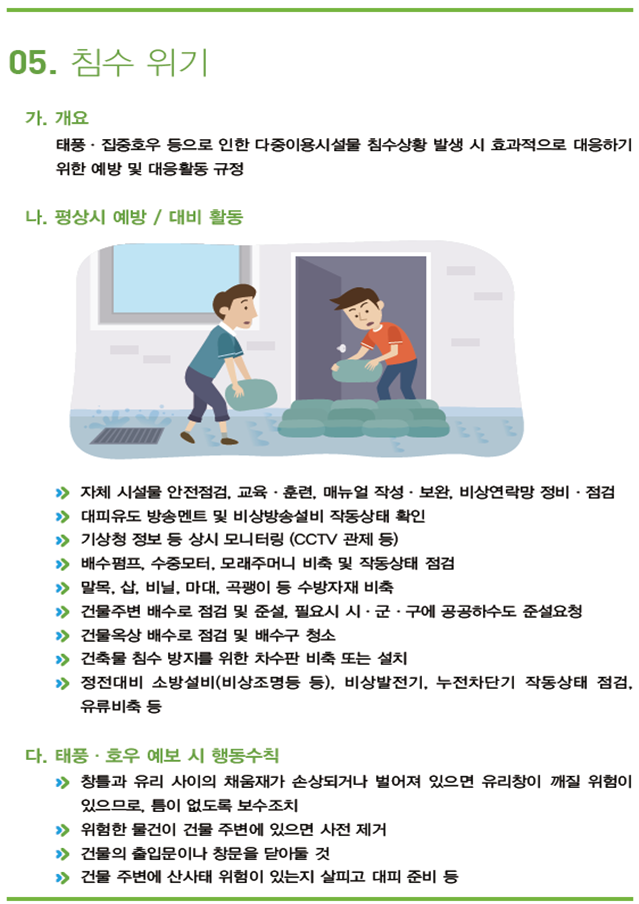| 침수되었을 때 전기시설에 가까이 가지 않기 ⇒ 침수되었을 때는 가로등, 전기 간판, 맨홀 뚜껑 등 감전 사고를 유발할 수 있는 전기시설물 근처 주의 |
