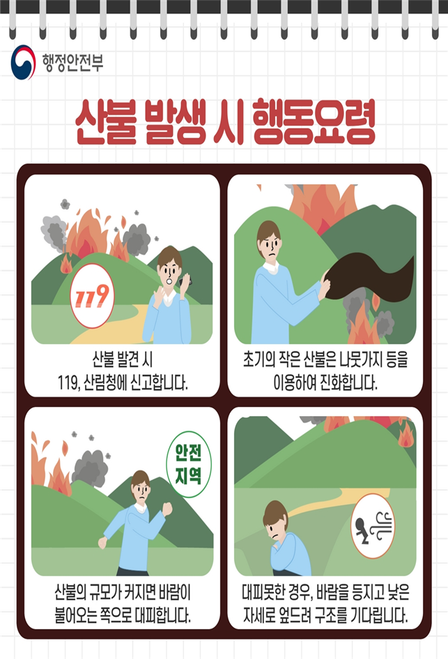 산 불 예 방 | ○ 산에 갈 땐 불씨는 두고 가세요~ ⇒ 산에 갈 때는 성냥·라이터 등 인화물질 소지 금지, 산림 및 산림 연접 지역에서 화기 취급 주의 |