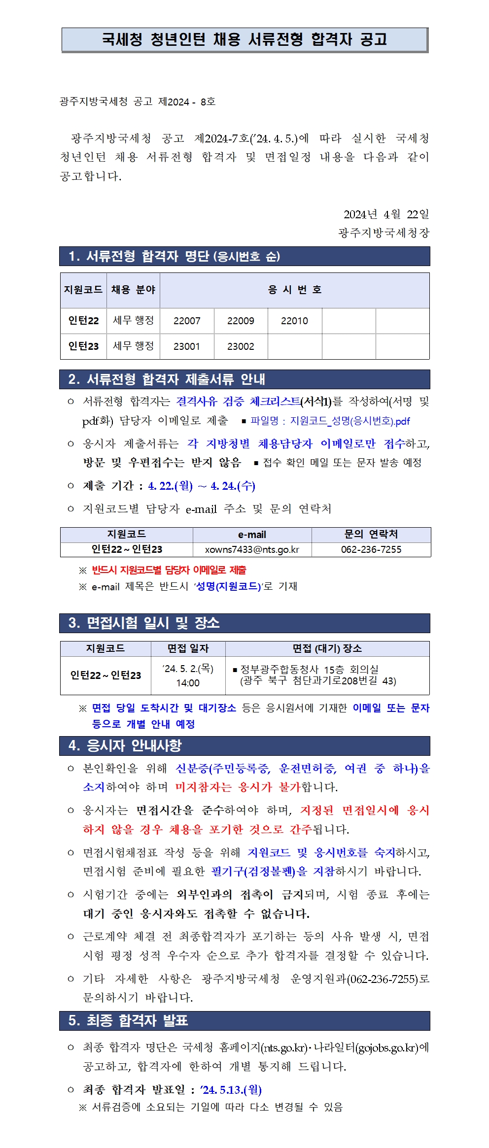 광주지방국세청 청년인턴 서류전형 합격자 공고