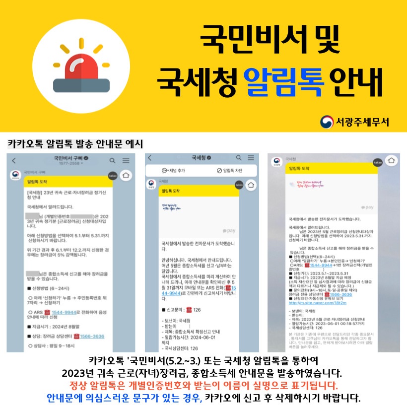 2023년 귀속 근로(자녀)장려금, 종합소득세 관련 국민비서 및 국세청 알림톡 안내