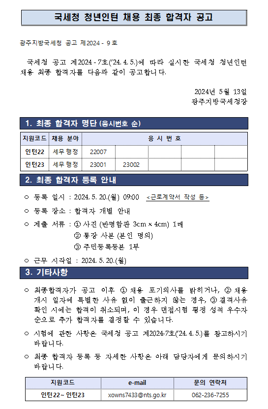 서광주세무서 공무직 근로자(환경관리)채용 공고