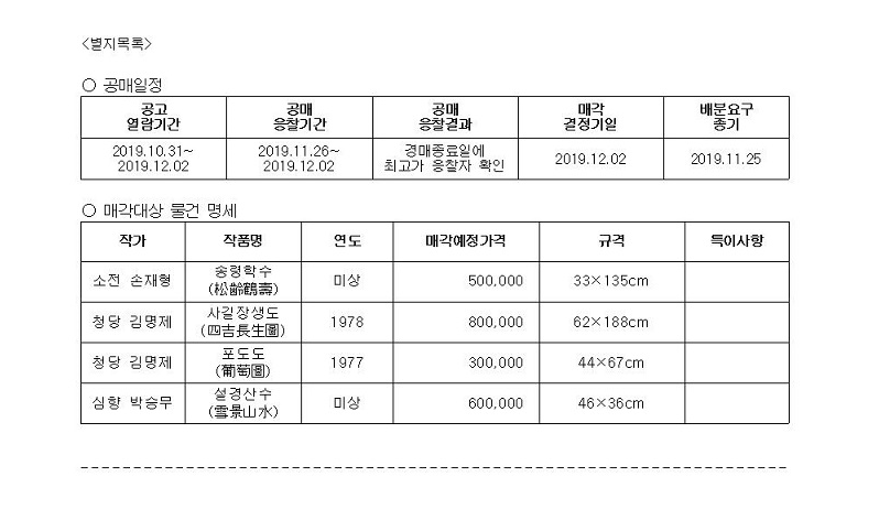 전문매각기관에 매각 의뢰한 예술품에 대한 공매 공고