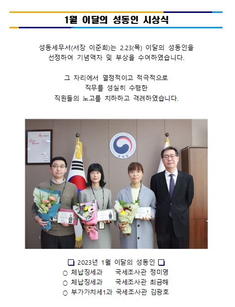 1월 이달의 성동인 시상식 성동세무서(서장 이준희)는 2.23(목) 이달의 성동인을 선정하여 기념액자 및 부상을 수여하였습니다. 그 자리에서 열정적이고 적극적으로 직무를 성실히 수행한 직원들의 노고를 치하하고 격려하였습니다