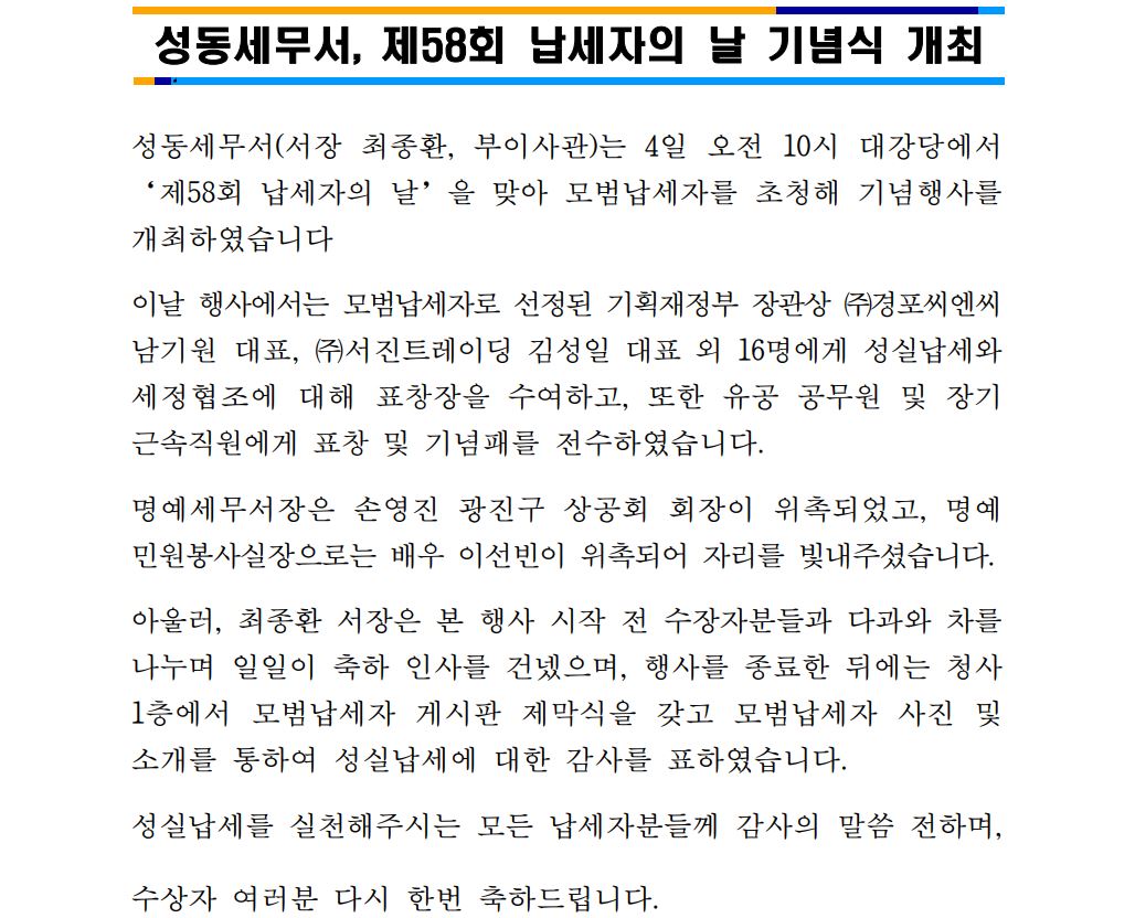 성동세무서, 제58회 납세자의 날 기념식 개최