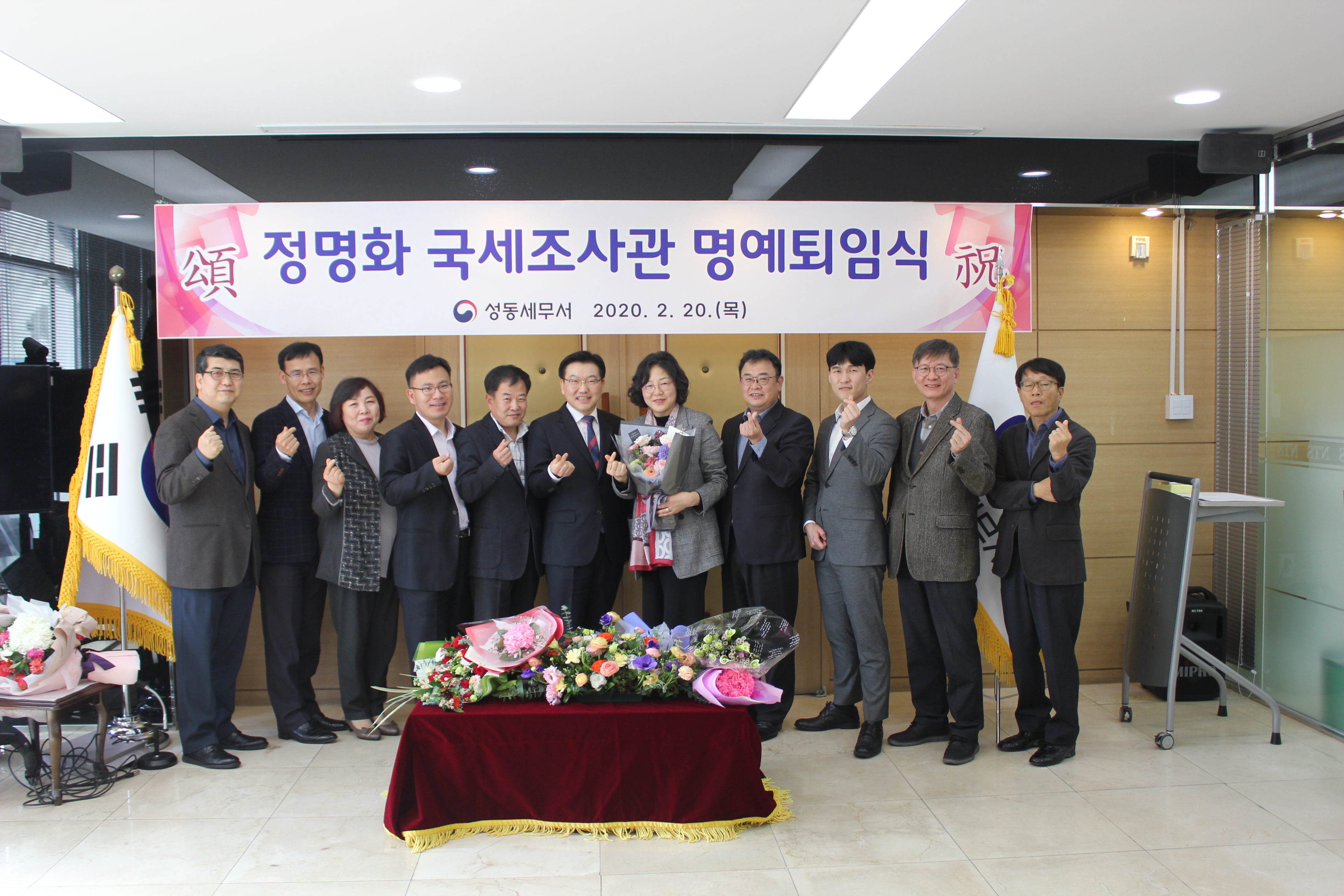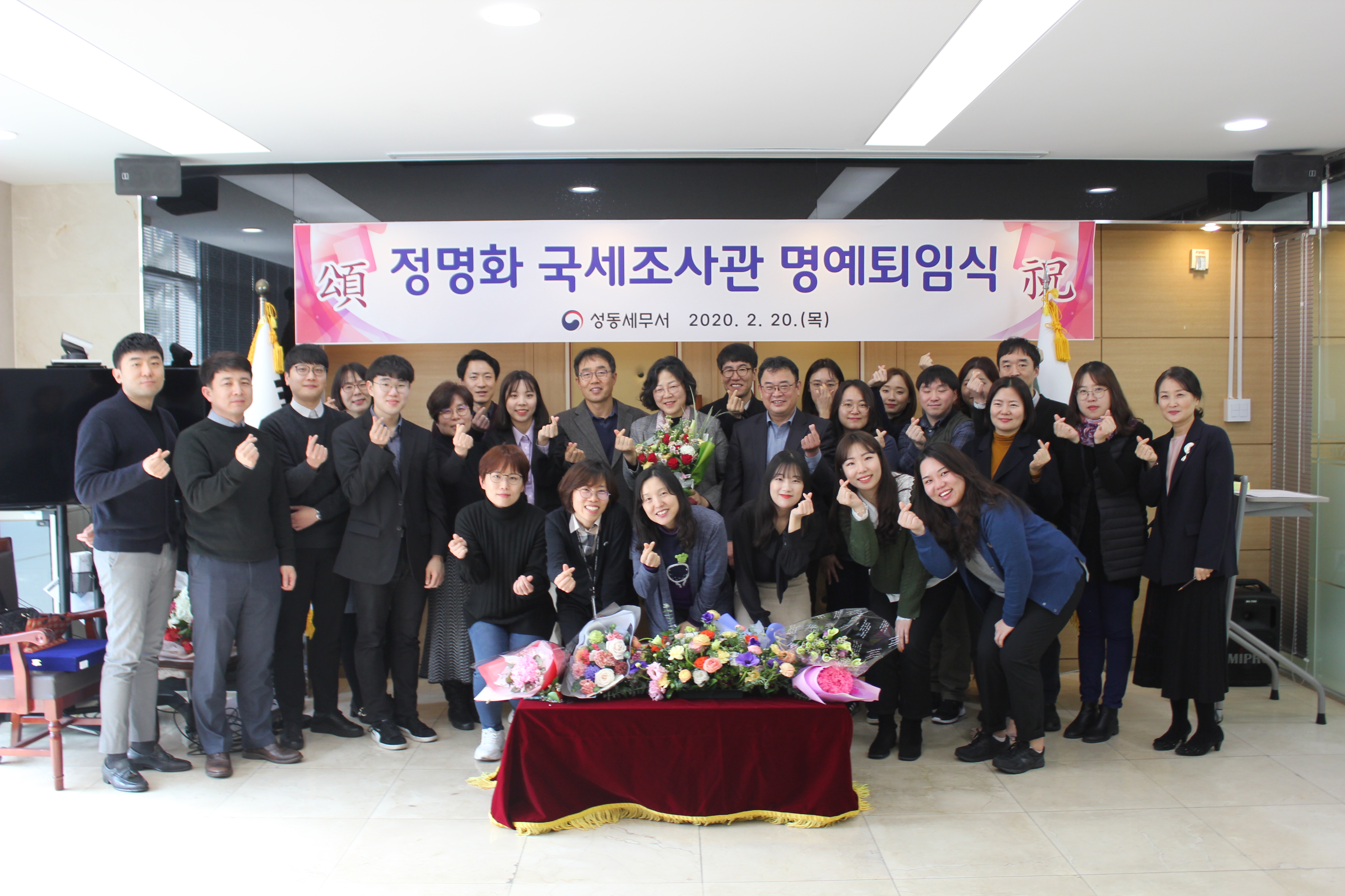 성동세무서(서장 장동희)는 2020. 2. 20.(목) 36년동안 남다른 애정과 봉사정신으로 국세행정 발전을 위해 헌신하신 정명화 조사관님의 퇴임식을 오후 14시 2층 소회의실에서 거행하였습니다. 직원들은 정든 국세청을 떠나 제2의 인생을 열어가실 정명화 조사관님의 무궁한 발전과 건승을 기원하였습니다.