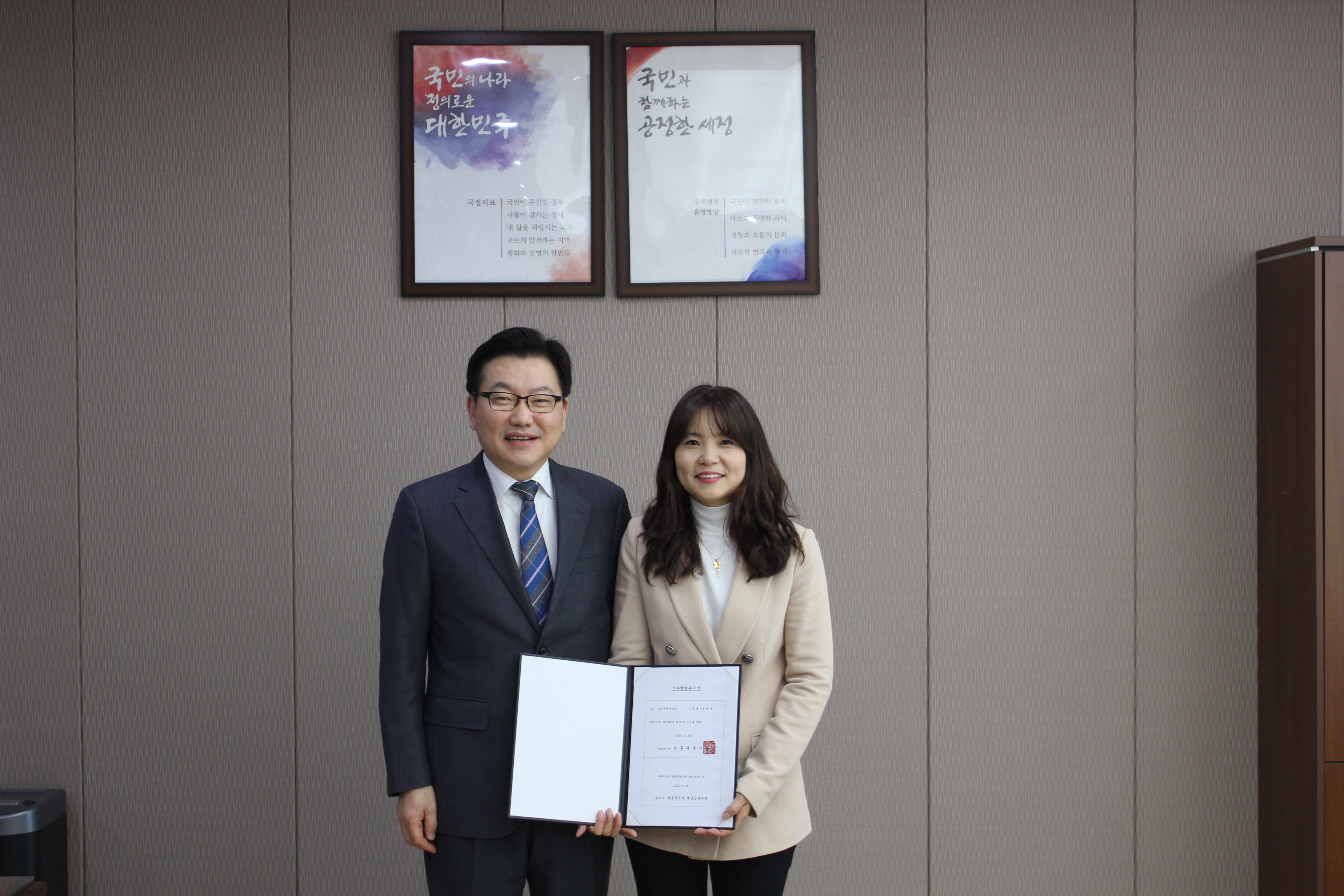 성동세무서(서장 장동희)는 2020. 3. 25.(수) 3층 서장실에서 복직자(재산세2과 정현정)에 대한 인사발령 통지서 수여식을 거행하였습니다. 장동희 세무서장은 복직한 직원에게 환영인사를 하고, 맡은 바 소임을 잘 하여 "국민이 공감하고 신뢰할 수 있는 국세행정"을 구현하는 데 일조해 달라고 당부하였습니다.