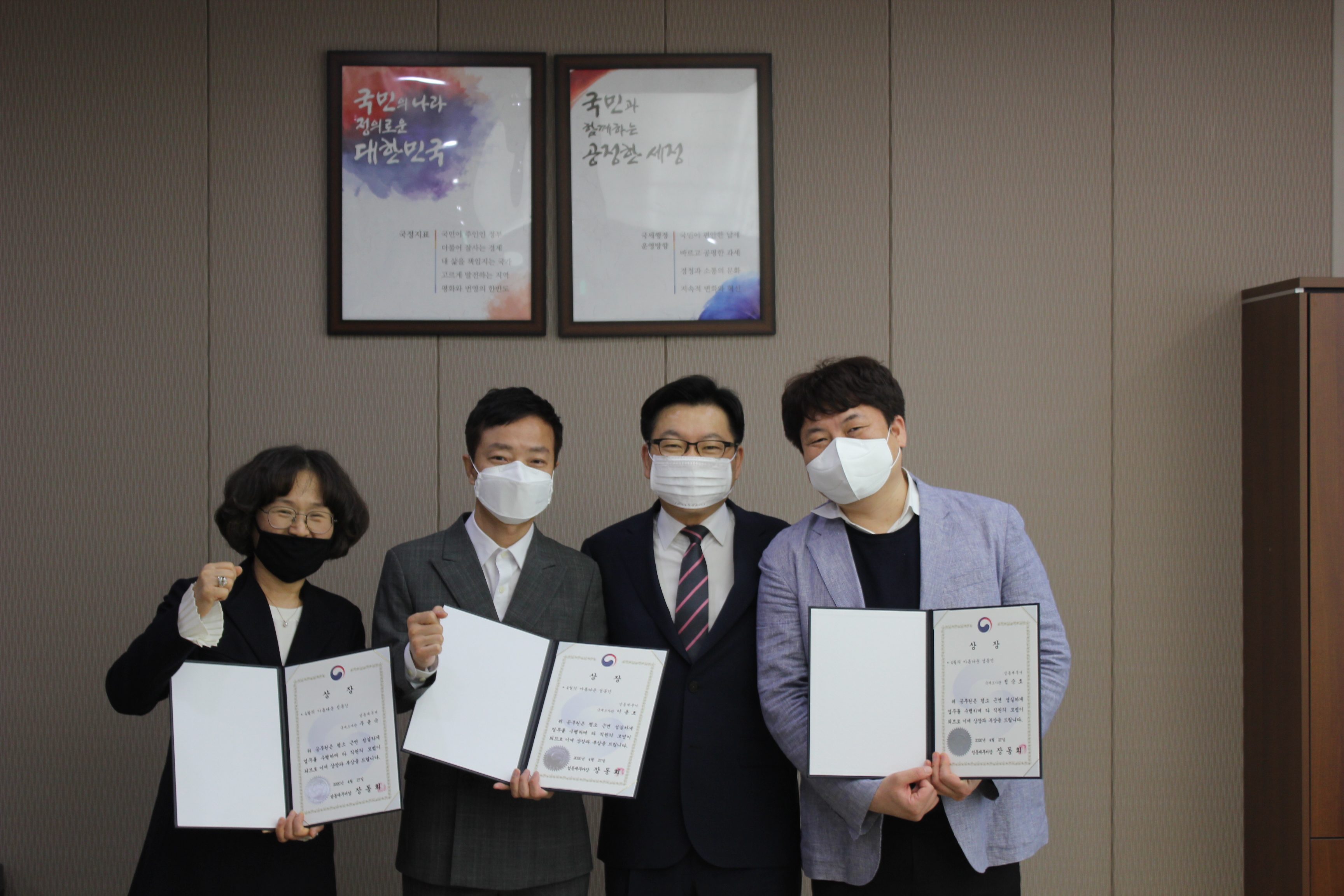 성동세무서(서장 장동희)는 4.27.(월)에 이달(4월)의 「아름다운 성동인」을 선정하여 표창 수여식을 치렀습니다. 장동희 서장은 선정된 직원들에 표창장과 부상(화분)을 수여하시고 직원들의 노고를 치하하였습니다. - 수상 명단 - 이용호 조사관(재산세2과) 정승호 조사관(조사과) 주윤숙 조사관(납세자보호담당관)