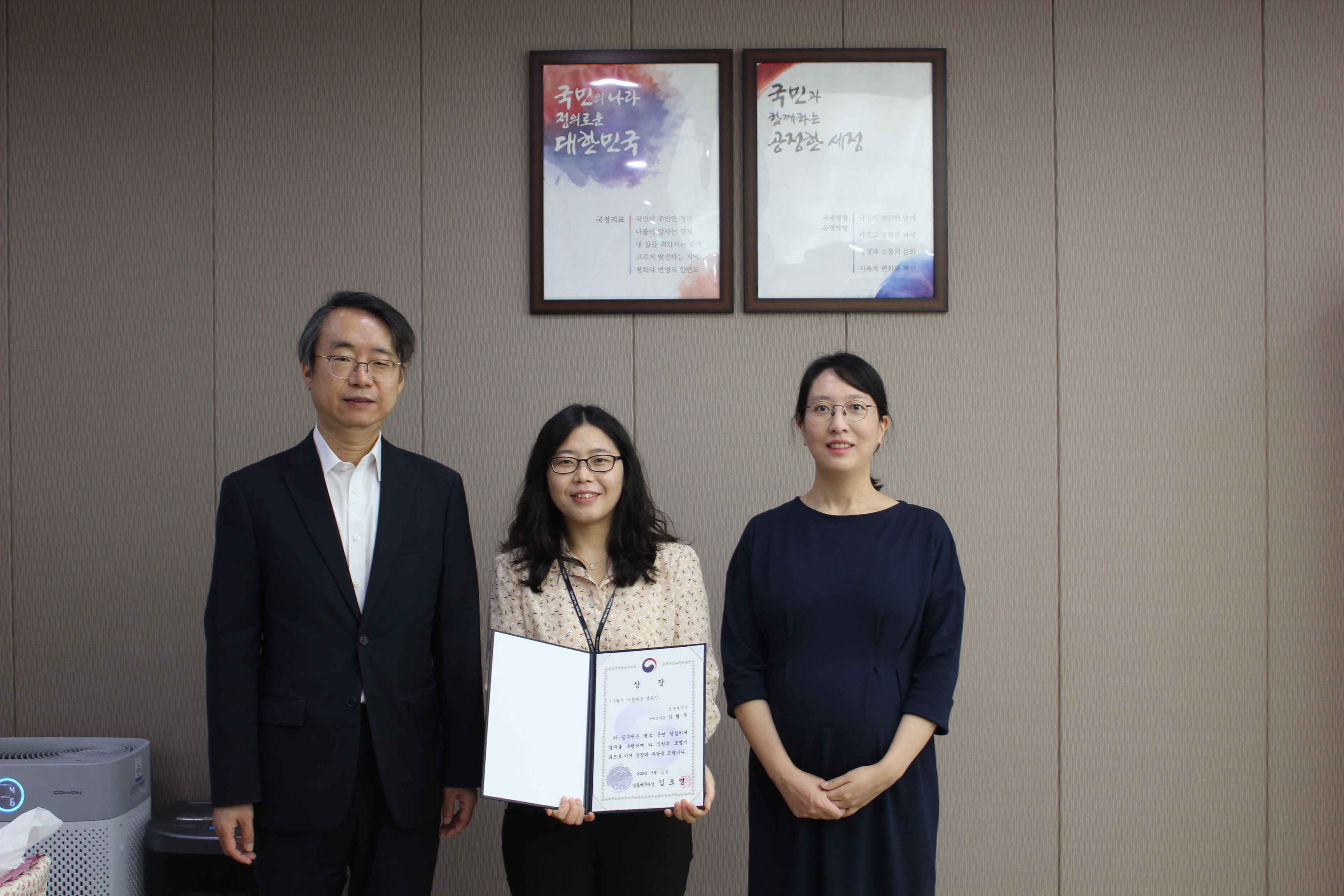 성동세무서(서장 김오영)는 9.11.(금)에 이달(8월)의 「아름다운 성동인」을 선정하여 표창 수여식을 치렀습니다. 김오영 서장은 선정된 직원들에게 표창장과 부상(화분)을 수여하고 직원들의 노고를 치하하였습니다.
