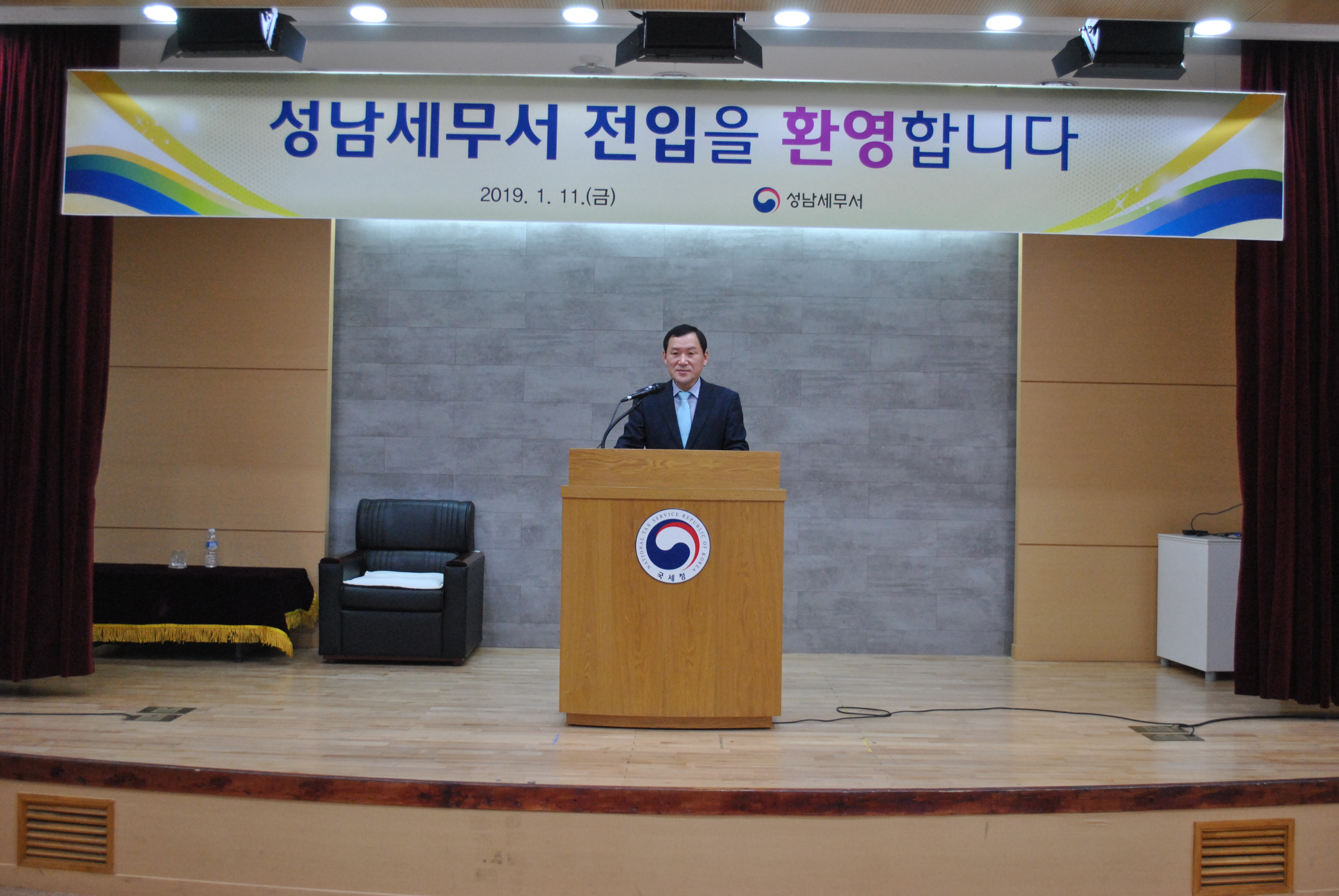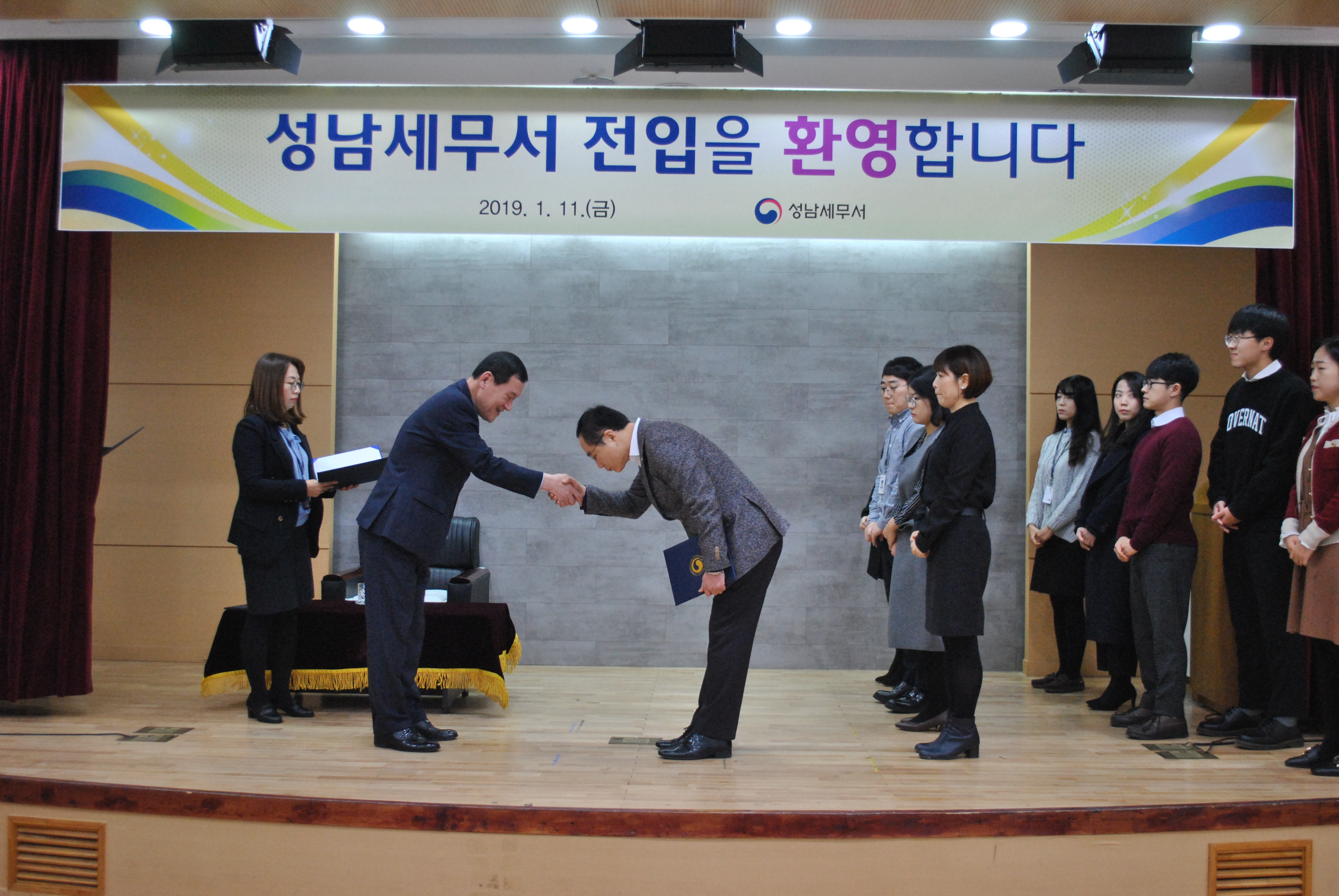 성남세무서(서장 박기현)은 2019.1.11. (월) 정기인사이동 직원에 대한 인사발령 통지서 수여식을 실시하였습니다.성남세무서 전입을 환영합니다. ▲ 박기현 성남세무서장의 정기인사이동 축하인사 전달 ▲ 인사발령통지서 수여 모습