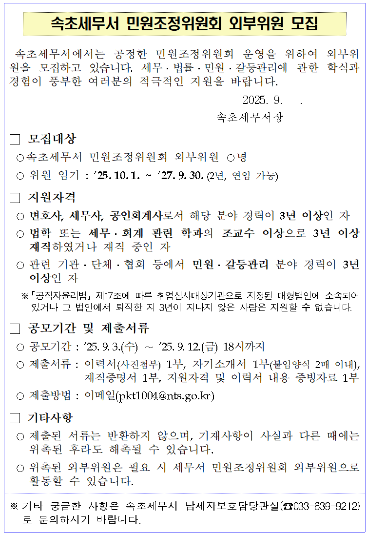 속초세무서 민원조정위원회 외부위원 모집