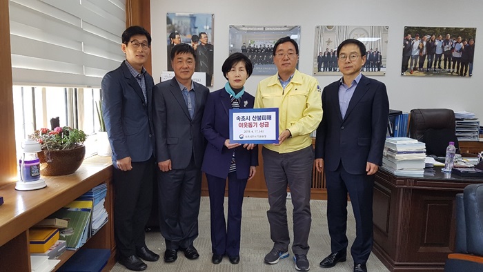 속초세무서(서장:임지순)는 2019년 4월 17일 전 직원이 동참하여 모금한 산불피해성금을 속초시에 전달했습니다.