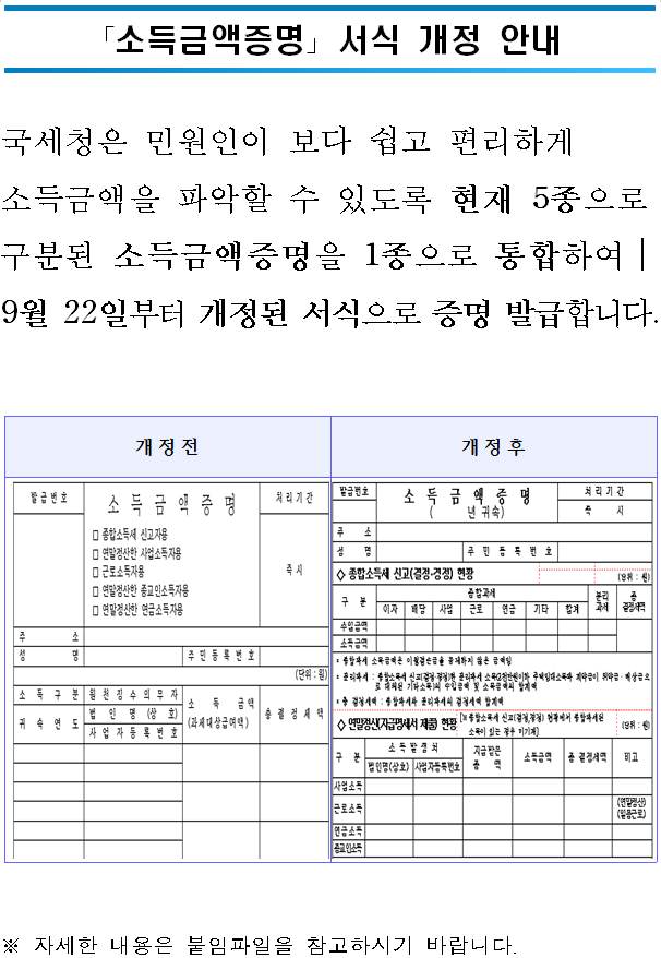 「소득금액증명」 서식 개정 안내