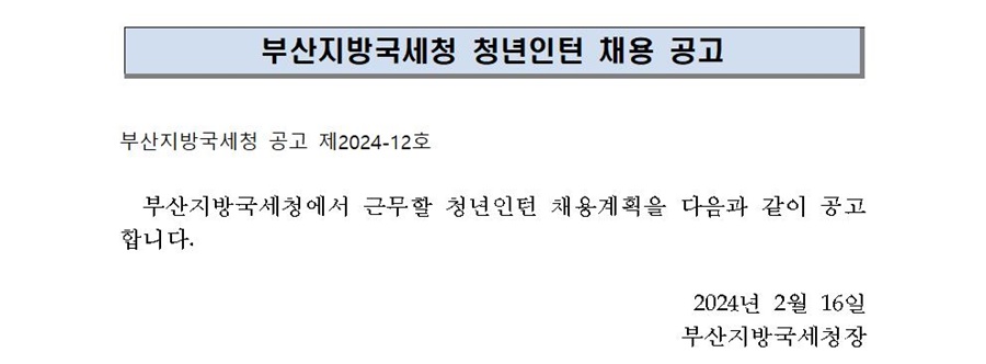 부산지방국세청 청년인턴 채용 서류전형 합격자 공고