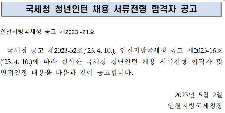 국세청 청년인턴 채용 서류전형 합격자 공고