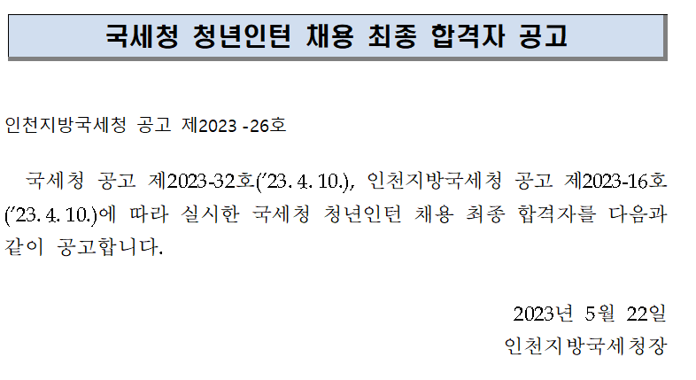 국세청 청년인턴 채용 최종 합격자 공고