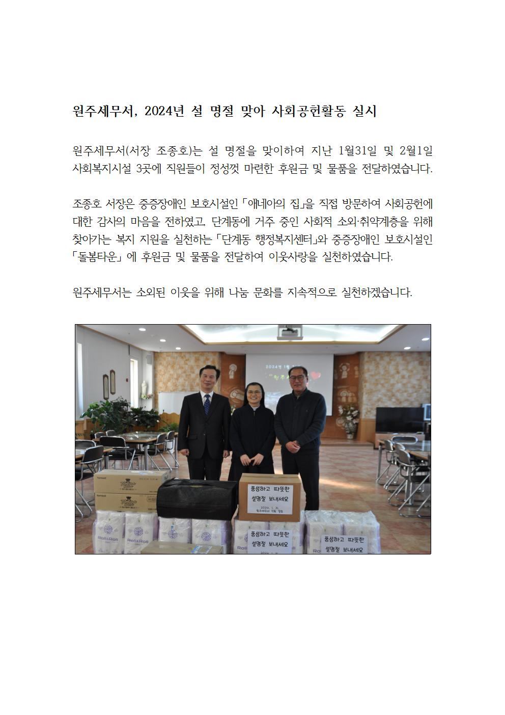 원주세무서, 2024년 설 명절 맞아 사회공헌활동 실시