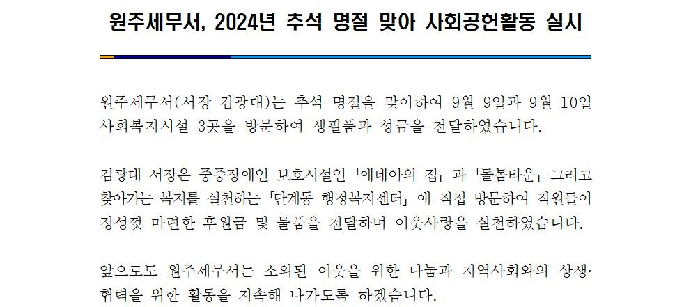 원주세무서, 2024년 추석 명절 맞아 사회공헌활동 실시