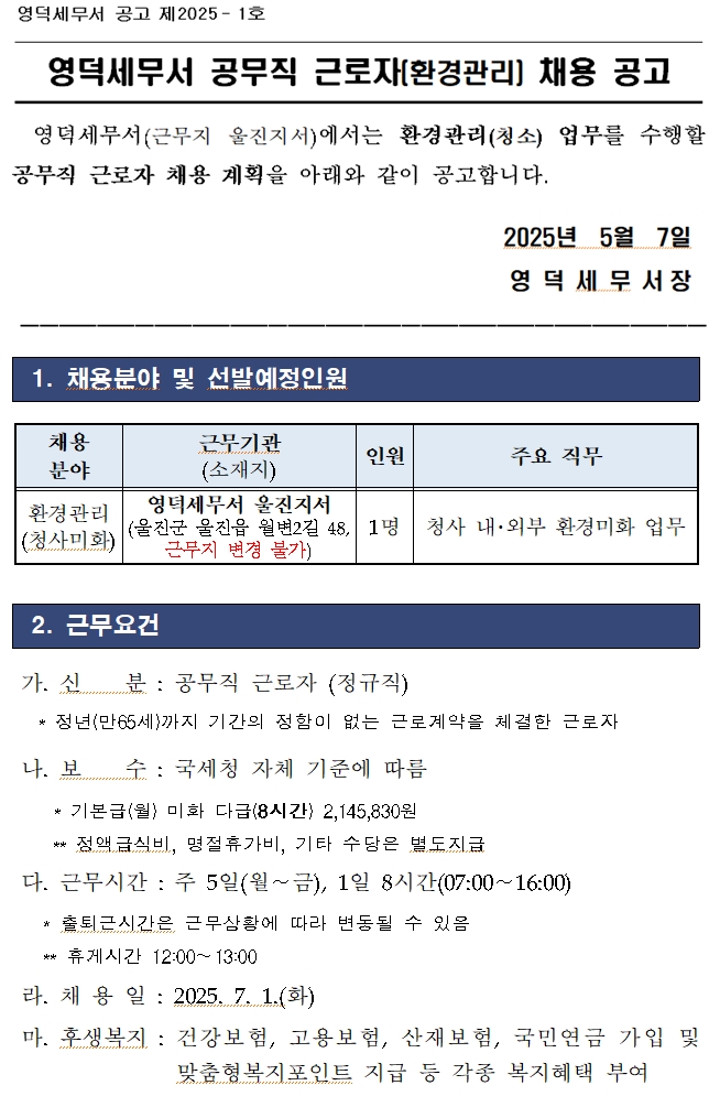 영덕세무서 공무직 근로자(환경관리) 채용 공고