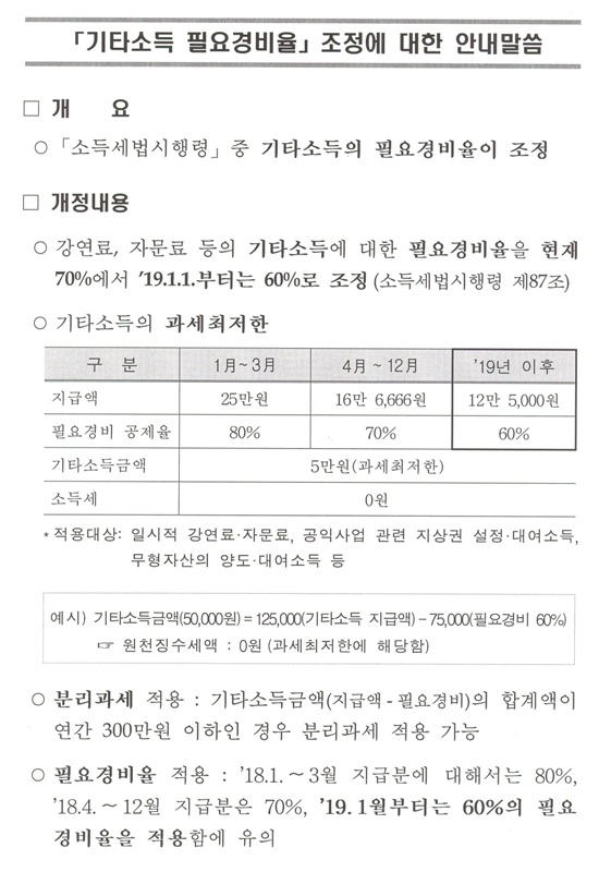 「기타소득 필요경비율」조정 안내