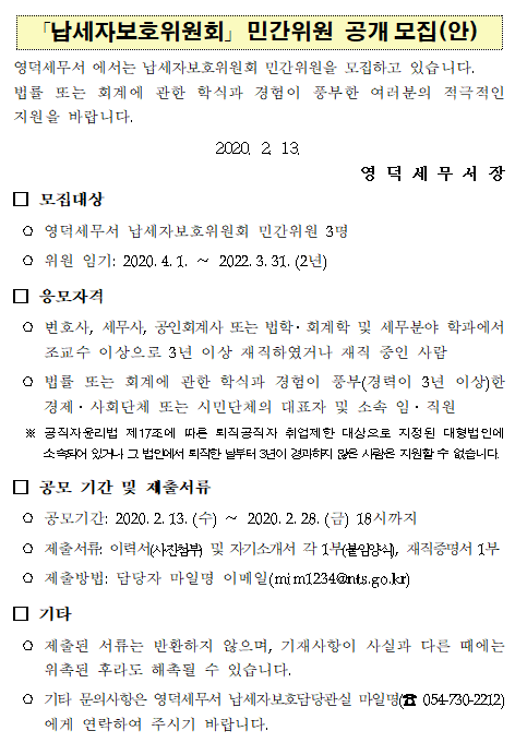 「납세자보호위원회」 민간위원 공개모집