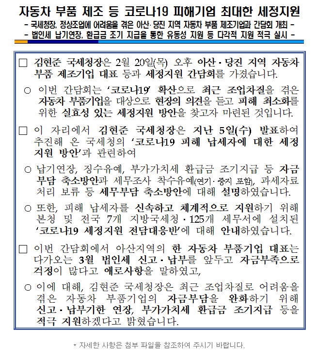 자동차 부품 제조 등 코로나19 피해기업 최대한 세정지원