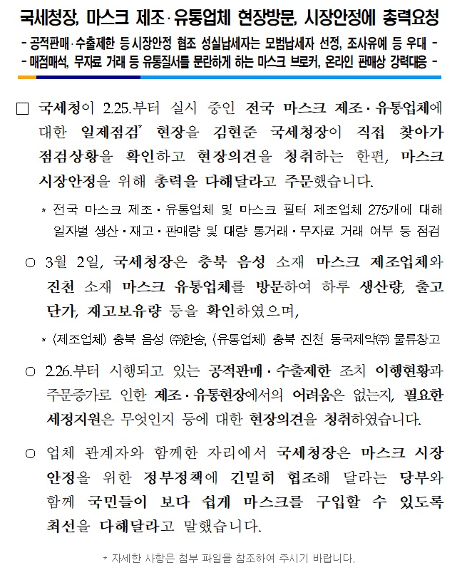 200302_국세청장, 마스크 제조·유통업체 현장방문, 시장안정에 총.hwp