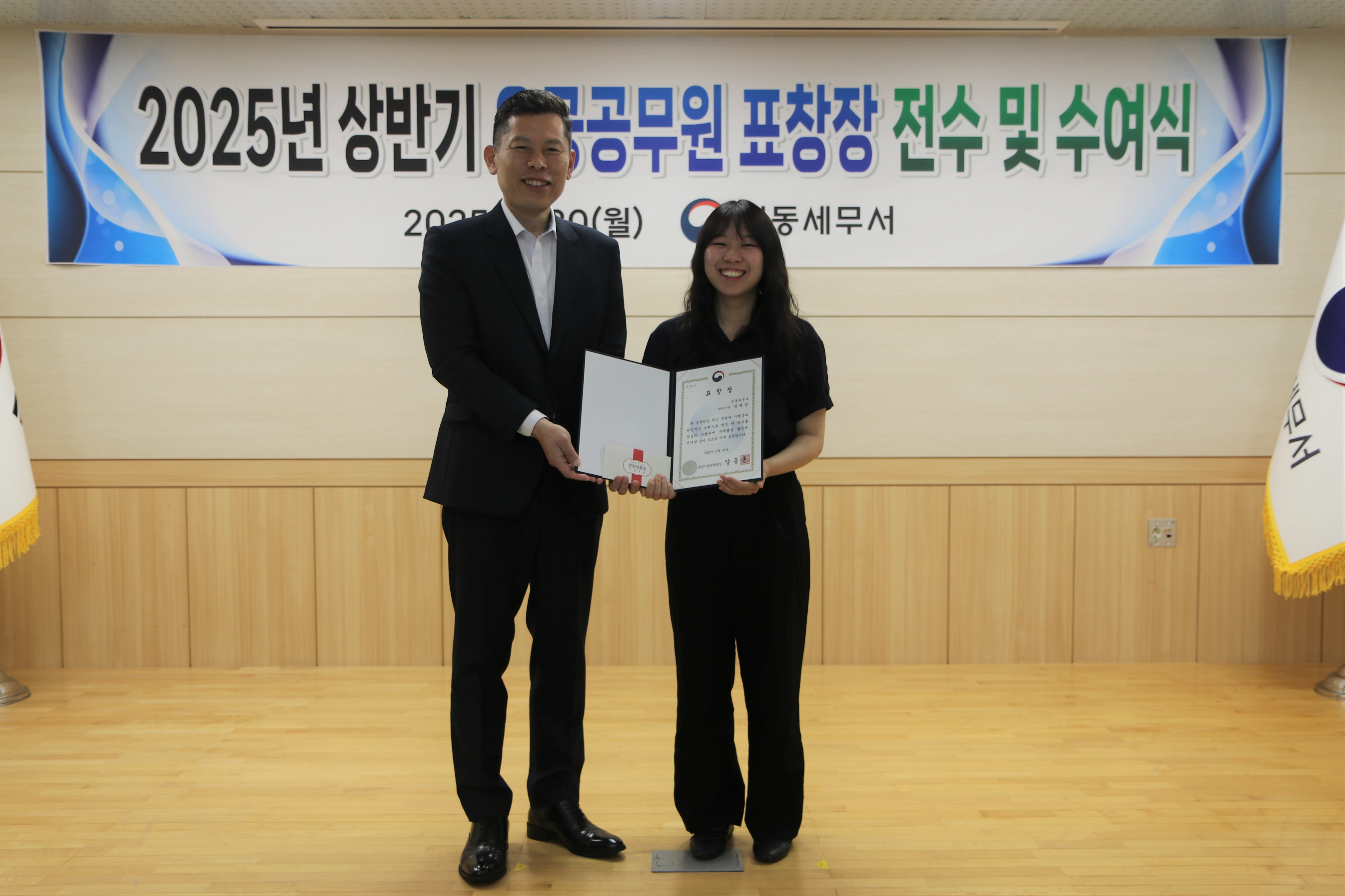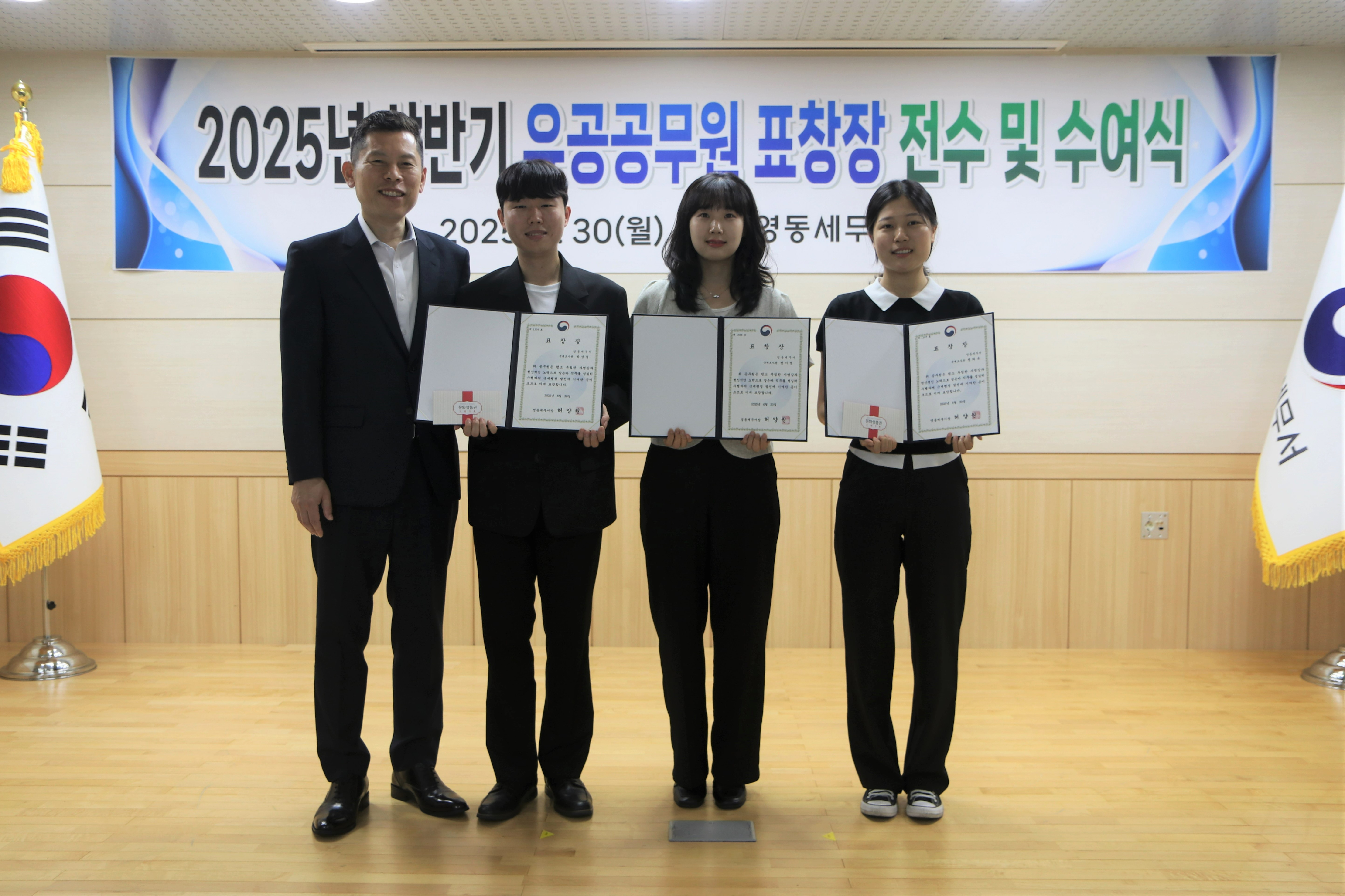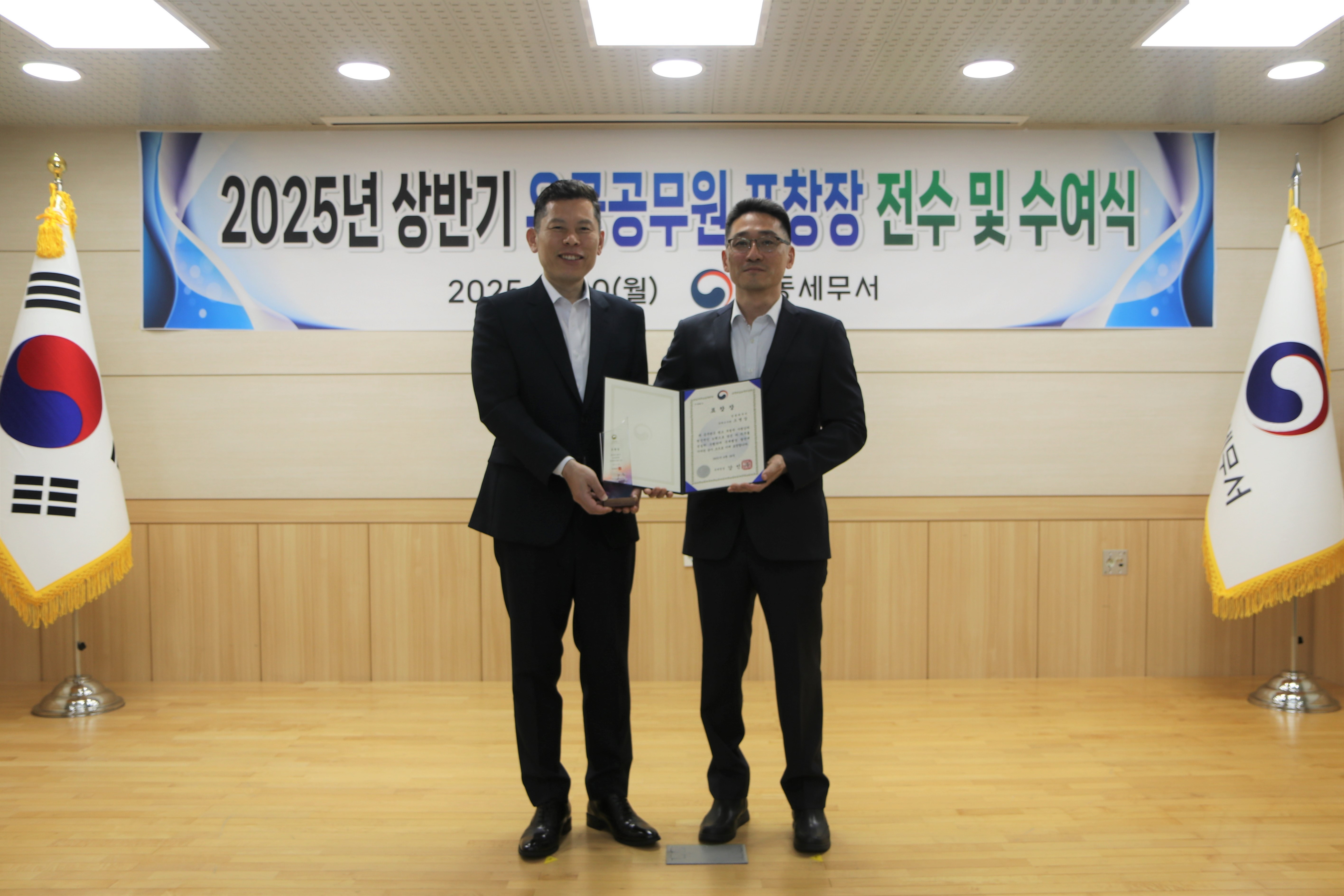 영동세무서(서장 허양원)는 2025.6.30. 3층 대회의실에서 2025년 상반기 유공공무원에 대한 표창장을 전수 및 수여하였습니다.