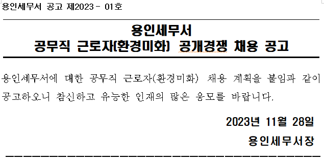 용인세무서 공무직 근로자(환경미화) 공개경쟁 채용 공고