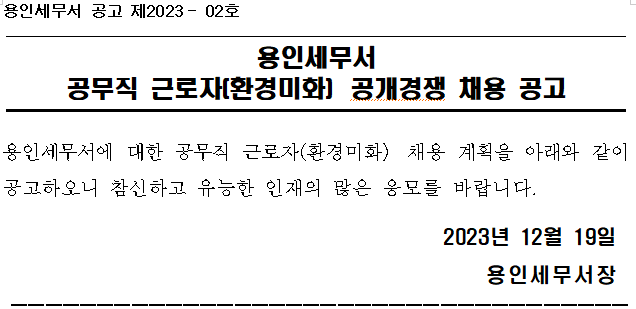 용인세무서 공무직 근로자(환경미화) 공개경쟁 채용 공고