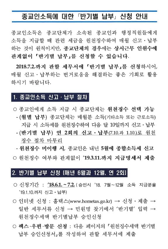 종교인소득에 대한 「반기별 납부」 신청 안내